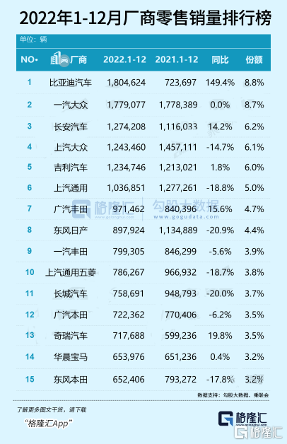 但三年后的2022年,比亚迪的销量飙升到了186.35万辆,同比增长208.64%,超越特斯拉卫冕全球新能源汽车销冠。