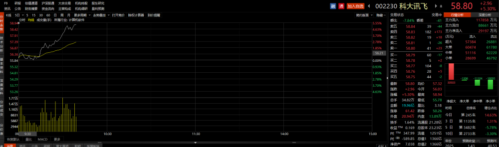 人工智能概念股科大讯飞今日(5月30日)盘中快速拉升,截至发稿时,涨幅超5%。