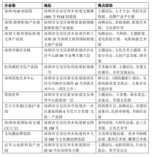 在分会场设置上,宝安突出“数字未来城”展示概念,借助数字化展现形式,描绘宝安世界先进制造业强区,战略性新兴产业生态集群和文体旅商融合发展的远景宏图。11家分会场深圳F518创意园、深圳·新桥影视产业基地、深圳大视界国际影视文体产业园、深圳书城宝安城、松岗琥珀文化产业园、深圳滨海艺术中心茶阅世界、艺立方非遗(文旅)产业园、深圳西部国际珠宝城(宝立方)、文化潮汕博览园、定军山电影科技产业园。其中,深圳滨海艺术中心是今年新增的分会场,这也是该中心自2021年正式运营后首次申办文博会分会场。