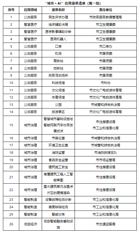 (十)推进“公共服务+AI”。民生诉求平台嵌入民意速办AI机器人,提高平台响应服务效率和质量。在医疗卫生机构探索开展临床辅助决策、医学影像辅助诊断、医用机器人等人工智能应用试点。依托口岸、机场、高铁站、地铁站、政务活动场所、科技文化体育场馆、公园、旅游景区等公共场所,搭建人工智能体验场景。(责任单位:市政务服务数据管理局、市卫生健康委、市口岸办、市国资委、市文化广电旅游体育局、市城管和综合执法局、市科协等)