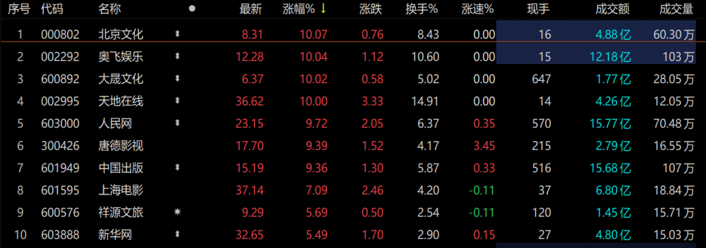 传媒板块持续活跃,奥飞娱乐涨停,天地在线4连板,北京文化、大晟文化2连板,人民网等跟涨。