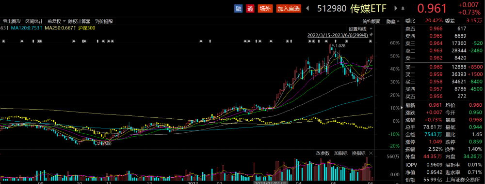 ETF方面,传媒ETF(512980)今日低开,盘中走强,现涨0.73%,盘中溢价交易,溢折率0.01%。6月5日,传媒ETF(512980)获主力资金净流入0.24亿元。
