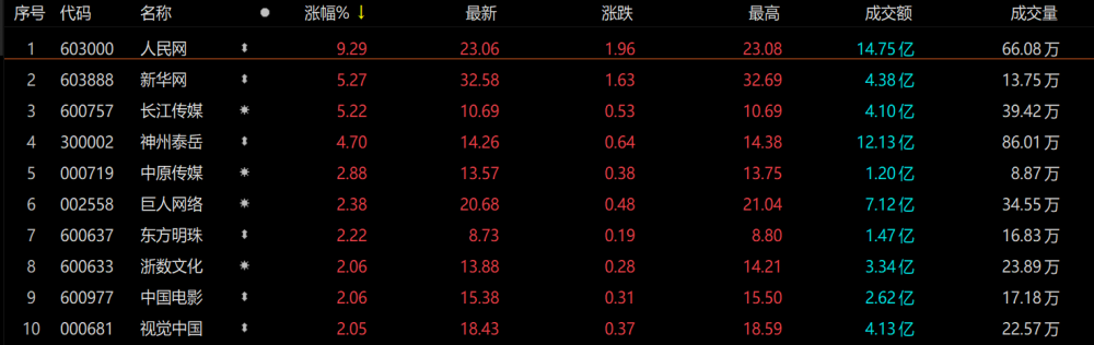 成分股方面,涨幅方面,人民网涨超9%,新华网、长江传媒、神州泰岳、中原传媒、巨人网络等跟涨。下跌方面,宝通科技跌超5%,其余成分股跌幅均在2%以内。