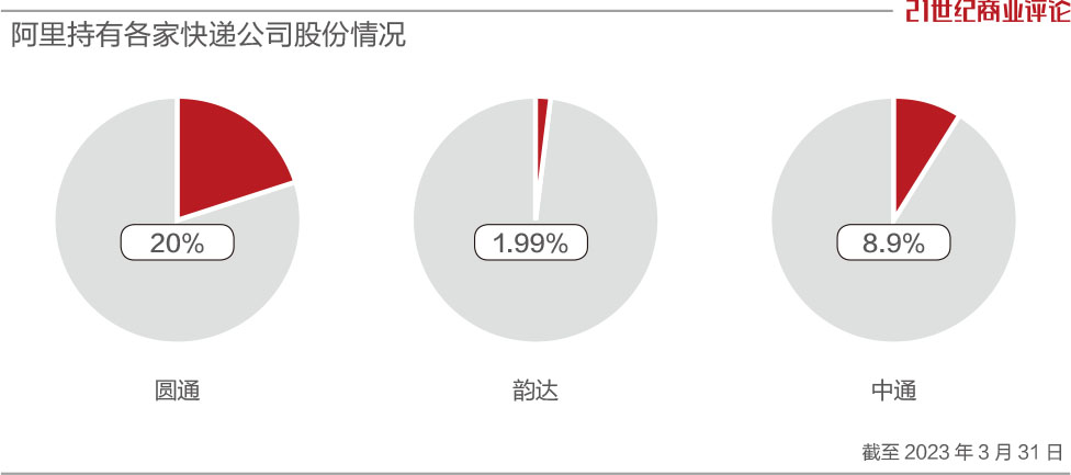 截至3月末,阿里系分别持有圆通约20%的股份、韵达1.99%的股份,以及中通8.9%的股份。