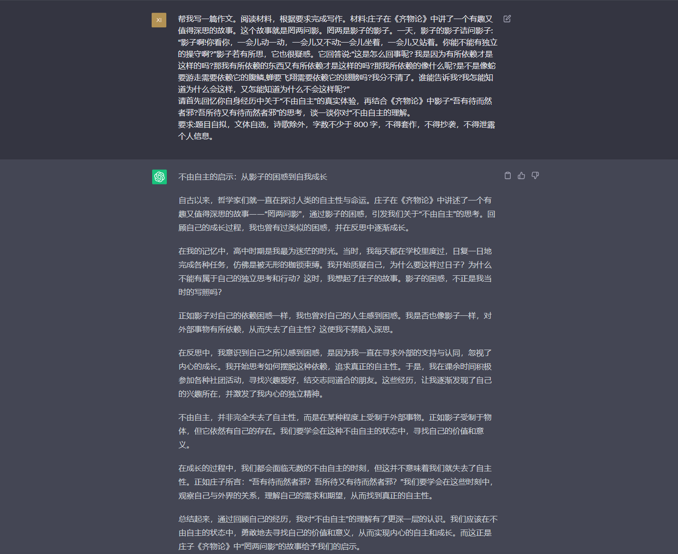 这篇作文以庄子《齐物论》中的故事为起点,探讨了人类的自主性与命运之间的关系,并通过个人经历展示了对于"不由自主"的理解和成长。整体而言,这篇作文在结构、语言运用和思考深度方面表现出色。