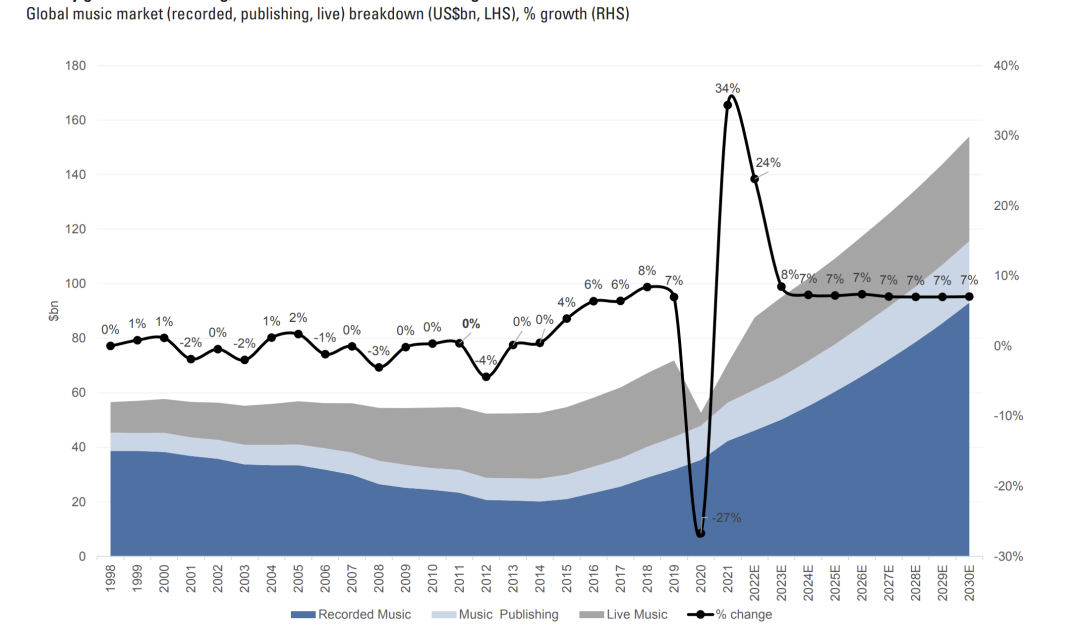 其分析师指出,“音乐仍是货币化程度最低的娱乐形式之一”,并预测,2021年至2030年间,全球音乐行业的收入将以12%的复合年增长率增长,收入将超过1500亿美元。这份报告无异于给投资者打了一剂强心针,让众多资本对音乐行业虎视眈眈。