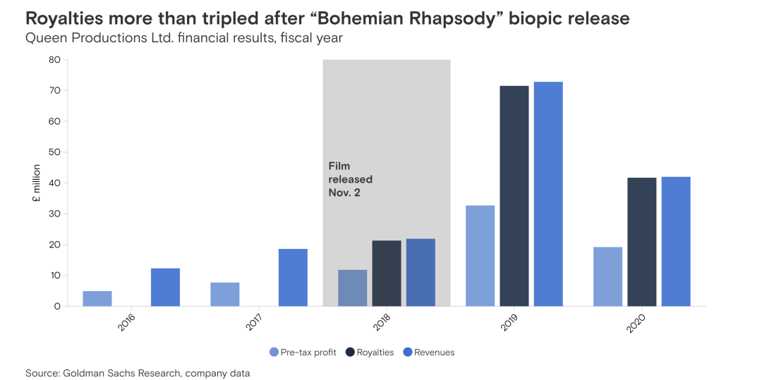 在电影《波西米亚狂想曲》前后,Queen版税收入的变化情况不仅如此,高盛和KKR还一起投资了以音娱为重点的私募股权基金Atwater Capital Fund,后者是美国唱片公司88Rising、瑞典无版权音乐Epidemic Sound的投资方。美国私募股权公司Francisco Partners收购了音乐独角兽Kobalt的控股权。在去年Kpop席卷全球之际,美国传奇投资家人Jim Rogers、风投公司Strong Ventures等也都对Kpop相关公司进行了投资。