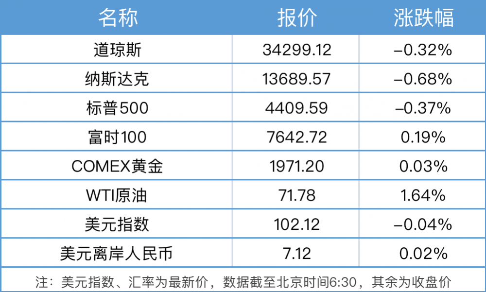 1、美股三大指数集体收跌,道指跌0.32%,本周累计上涨1.25%;纳指跌0.68%,本周累计上涨3.25%;标普500指数跌0.37%,本周累计上涨2.58%。热门中概股普跌,纳斯达克中国金龙指数跌1.09%,本周累计上涨5.53%。