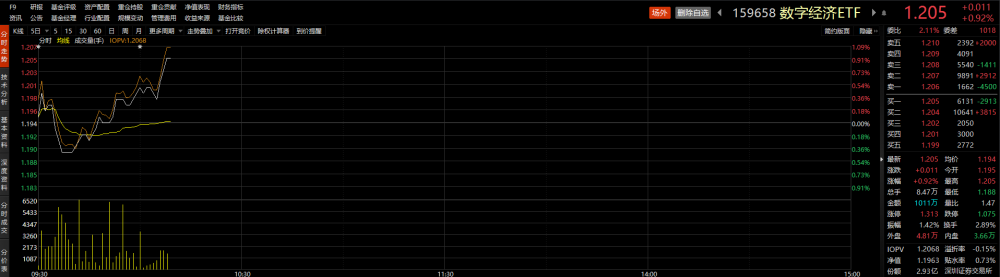 算力板块早盘再度活跃,寒武纪-U、中科曙光、浪潮信息等大涨。相关ETF方面,数字经济ETF(159658)盘中拉升,截至发稿时,涨幅为0.92%,报1.205元,为近2个月首次突破1.20元关口。