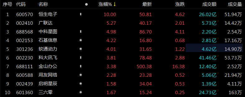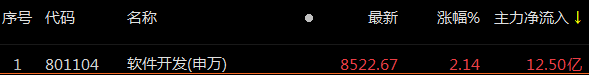 早盘软件开发板块获超12亿元主力资金抢筹,其中,恒生电子高开并快速拉升,截至发稿,恒生电子涨停,获接近4亿元主力资金抢筹。