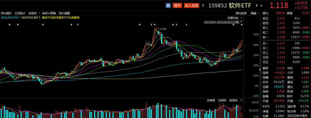恒生电子为软件ETF(159852)第三大重仓股,受恒生电子走高影响,软件ETF(159852)早盘震荡走强,一度涨超2%,现涨1.73%,溢折率0.17%,盘中溢价交易,换手率5.21%,成交额6566万元,交投活跃。