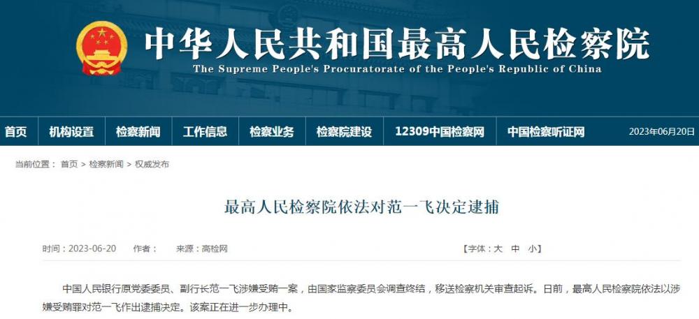 中国人民银行原党委委员、副行长范一飞涉嫌受贿一案,由国家监察委员会调查终结,移送检察机关审查起诉。日前,最高人民检察院依法以涉嫌受贿罪对范一飞作出逮捕决定。该案正在进一步办理中。