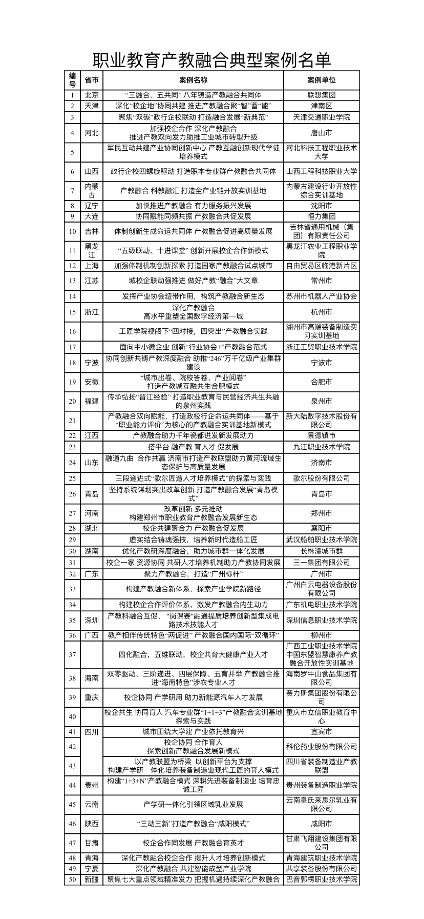 21世纪经济报道记者从国家发改委获得50个职业教育产教融合典型案例名单,具体如下:
