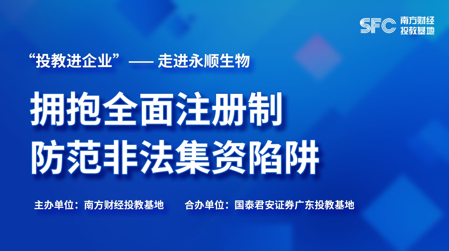 6月20日,由南方财经投教基地主办,国泰君安证券广东投教基地合办的“投教进企业”走进永顺生物的活动在广州黄埔举行。本次活动以“拥抱全面注册制,防范非法集资陷阱”为主题,面向企业员工、厂区工人普及防范非法金融活动和投资理财知识。