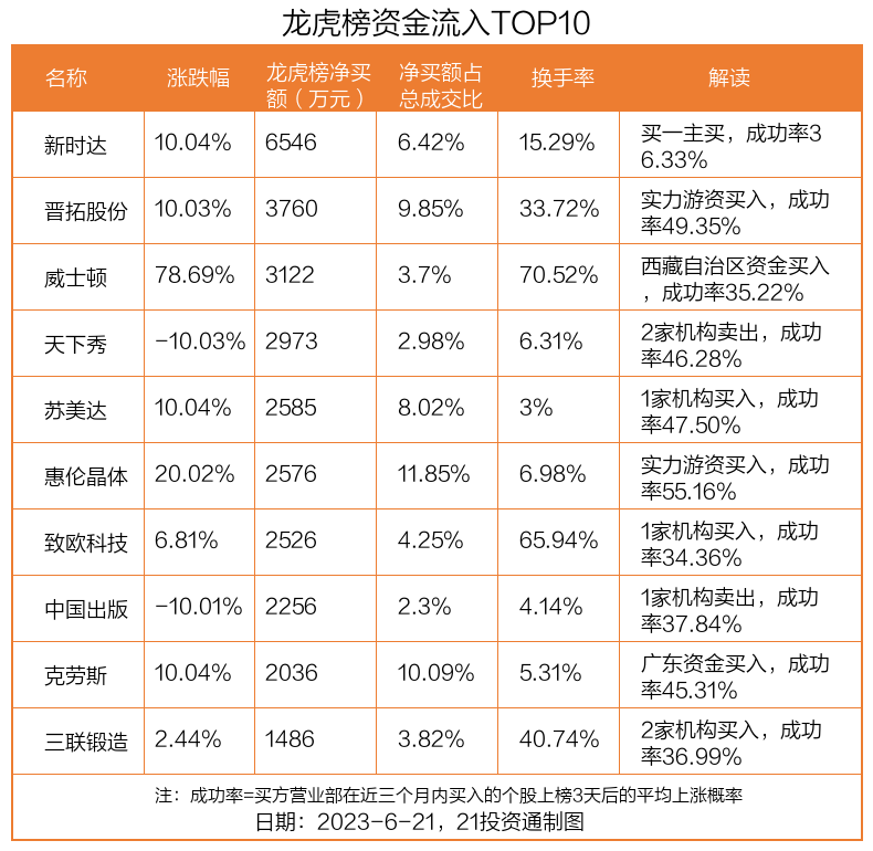6月21日,上证指数下跌1.31%,深证成指下跌2.18%,创业板指下跌2.62%。盘后龙虎榜数据显示,共有57只个股因当日异动登上龙虎榜,资金净流入最多的是新时达(002527.SZ),达0.65亿元。