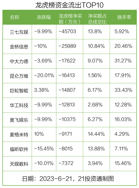 而龙虎榜中资金净流出最多的是三七互娱(002555.SZ),被净卖出为4.57亿元,占总成交金额的13.8%。三七互娱收盘下跌9.99%,换手率为5.92%。