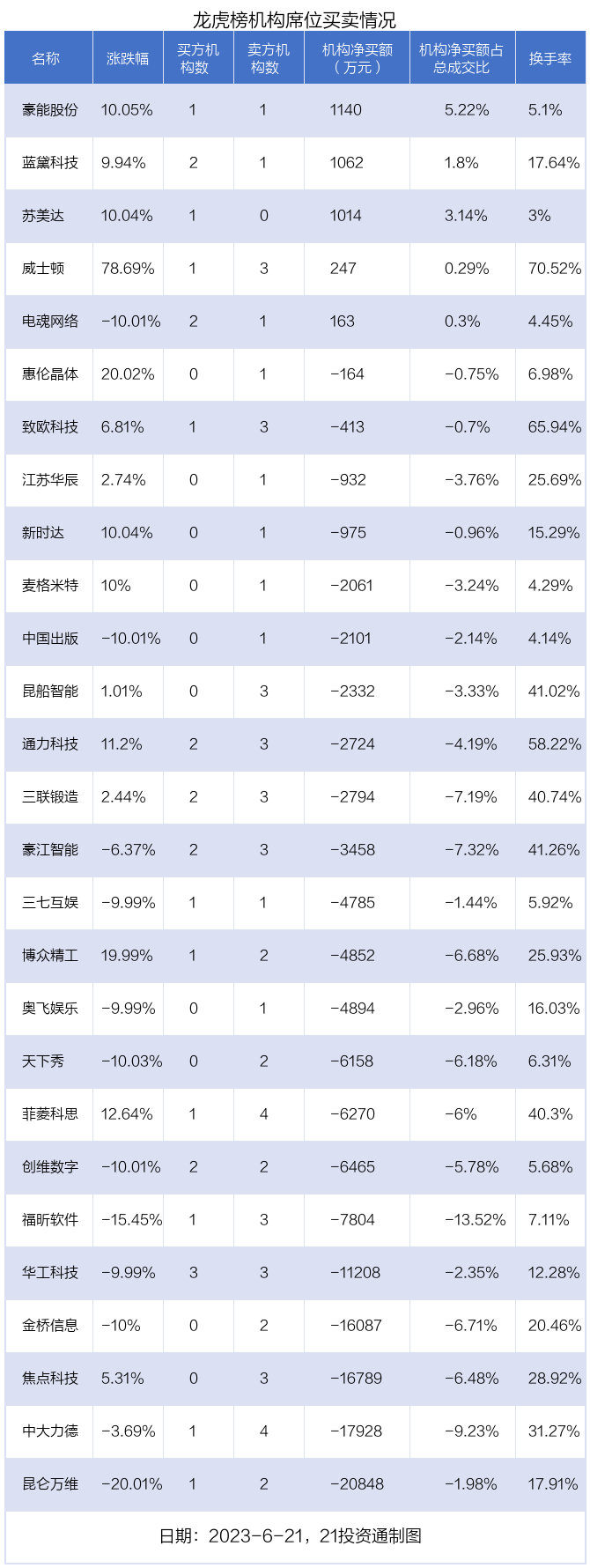 6月21日,27只个股龙虎榜出现了机构的身影,机构合计净卖出13.84亿元。具体来看,机构净买入5股,净卖出22股。