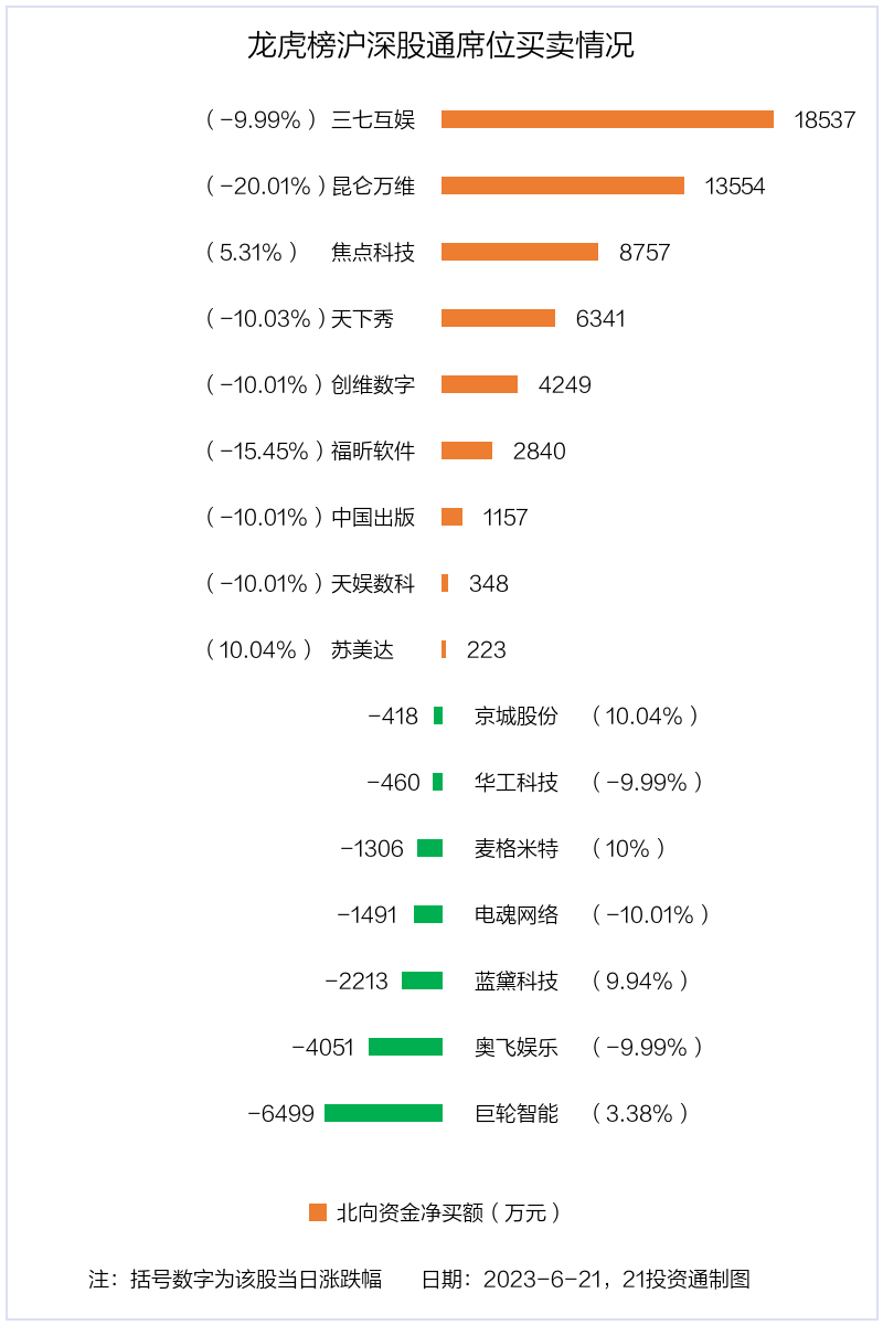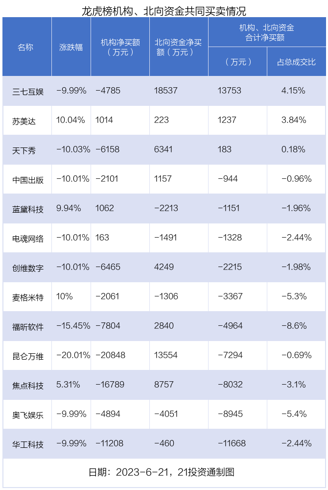 值得注意的是,机构和北向资金共同净买入了苏美达等1股;共同净卖出了华工科技、麦格米特、奥飞娱乐等3股;在三七互娱,昆仑万维,焦点科技,天下秀,创维数字,福昕软件,中国出版,电魂网络,蓝黛科技上出现分歧,机构净卖出三七互娱4784.51万元,北向资金净买入1.85亿元;机构净卖出昆仑万维2.08亿元,北向资金净买入1.36亿元;机构净卖出焦点科技1.68亿元,北向资金净买入8757.12万元;机构净卖出天下秀6158.4万元,北向资金净买入6341.37万元;机构净卖出创维数字6464.57万元,北向资金净买入4249.11万元;机构净卖出福昕软件7803.56万元,北向资金净买入2839.54万元;机构净卖出中国出版2100.56万元,北向资金净买入1156.59万元;机构净买入电魂网络163.18万元,北向资金净卖出1491.11万元;机构净买入蓝黛科技1061.71万元,北向资金净卖出2213.11万元。