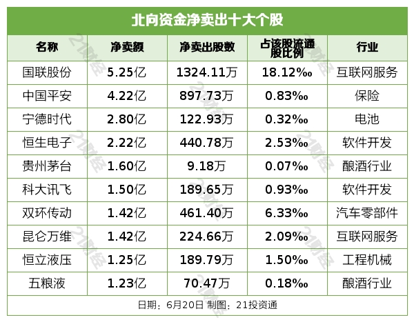北向资金净卖出国联股份(603613.SH)、中国平安(601318.SH)、宁德时代(300750.SZ)、恒生电子(600570.SH)、贵州茅台(600519.SH)居前,其中,国联股份被净卖出5.25亿元,中国平安被净卖出4.22亿元,宁德时代被净卖出2.80亿元,恒生电子被净卖出2.22亿元,贵州茅台被净卖出1.60亿元。