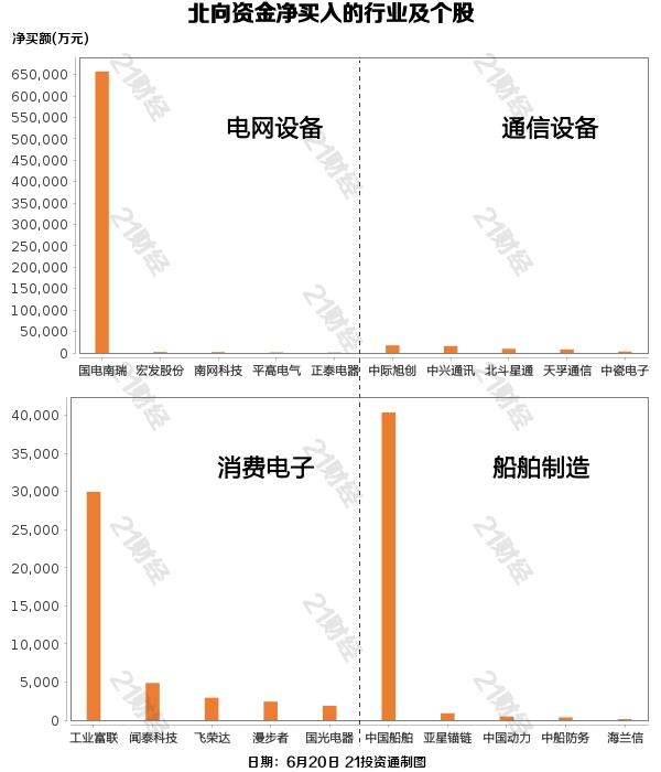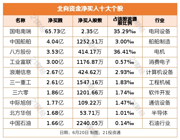 个股方面,北向资金净买入国电南瑞(600406.SH)、中国船舶(600150.SH)、八方股份(603489.SH)、工业富联(601138.SH)、浪潮信息(000977.SZ)居前,其中,国电南瑞被净买入65.73亿元,中国船舶被净买入4.04亿元,八方股份被净买入3.53亿元,工业富联被净买入3.00亿元,浪潮信息被净买入2.67亿元。