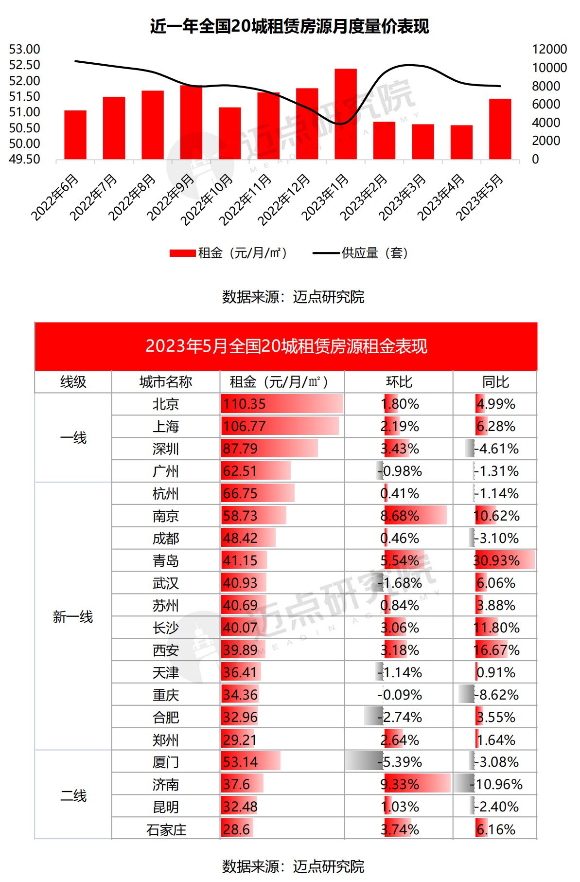 5月,中央在规范住房租赁市场的同时从金融端推动租赁住房贷款支持计划落地;从地方政府层面看,一方面深圳、沈阳、上海出台相关政策加强租赁住房管理,石家庄、广州、海口等城市以优化公租房政策、增加保障性租赁住房供给等方式加速培育和发展住房租赁市场;据统计5月土地端仅福州、宁波成交纯租赁用地;河北、博州、新疆等省市地区公布保障性租赁住房的筹集进度和供应计划;随着毕业季的临近以及换租需求的提前释放,租赁市场进入传统旺季预热期,5月整体租赁市场租金开始回升,全国20城住房租赁市场量稳价涨。