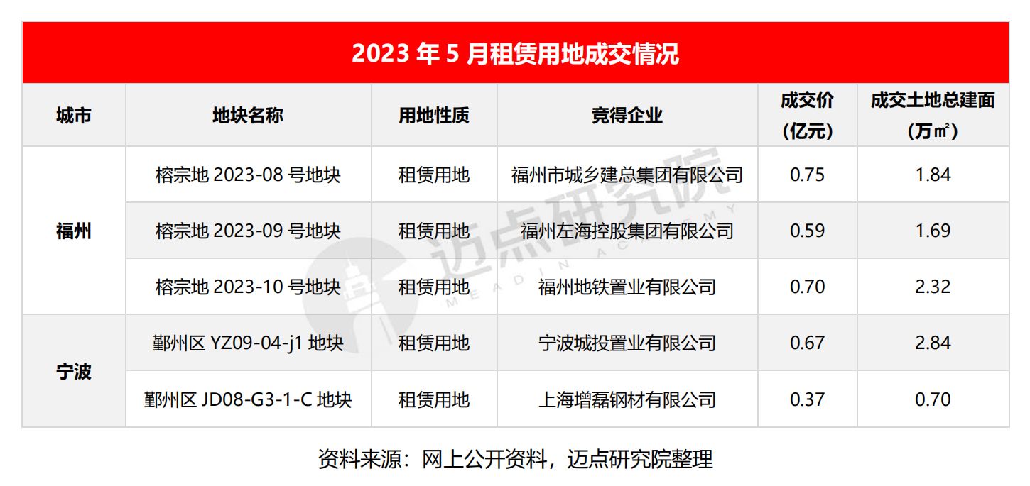 1、租赁用地成交:福州5月成交3宗租赁用地,成交土地建设面积5.85万㎡;宁波5月成交2宗租赁用地,成交土地建设面积3.54万㎡