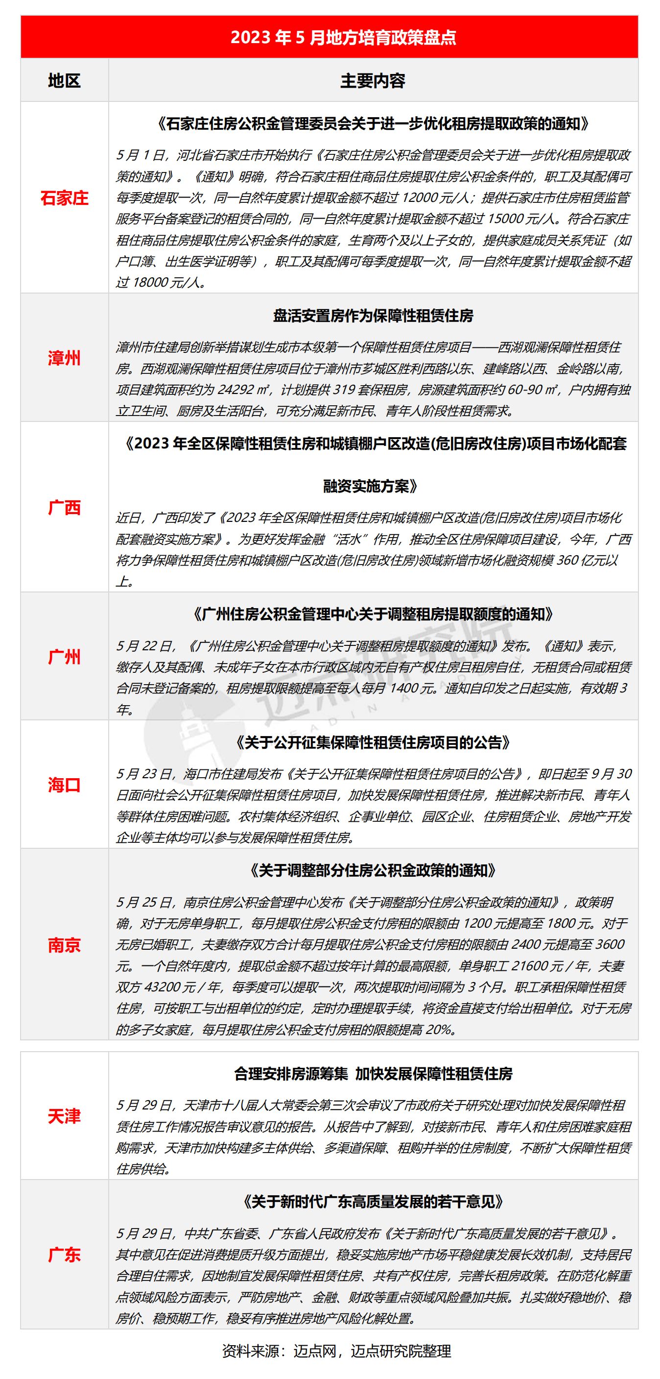 地方政府因地制宜多方面多渠道加速培育和发展租赁市场:天津加快构建住房保障新格局、广东完善长租房政策;广西拟新增融资360亿元建设保障房;石家庄、广州和南京优化公积金提取方案;漳州、海口从盘活安置房、征集保障性租赁住房项目等方面增加保障性租赁住房供给。