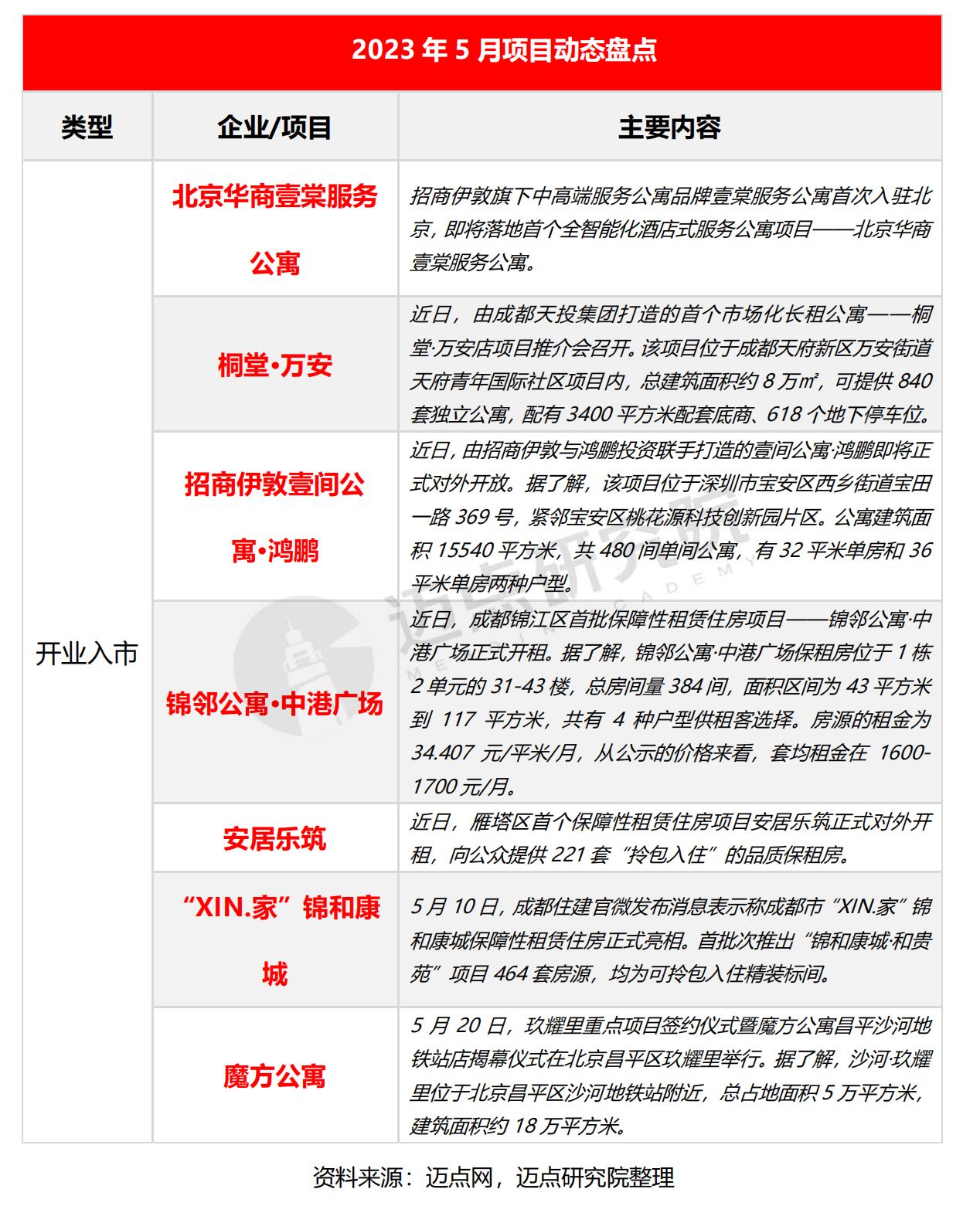 开业方面,本月,多个住房租赁项目上线。如招商蛇口壹棠服务公寓新品北京华商壹棠即将上线;招商伊敦壹间公寓·鸿鹏即将对外开放;魔方公寓昌平沙河地铁站店揭幕;西安雁塔区首个保障性租赁住房项目安居乐筑对外招租,此外多个公寓项目在成都亮相,成都天投集团首个租赁型社区桐堂·万安店项目推介会召开,锦江区首批保障性租赁住房项目——锦邻公寓·中港广场正式开租,成都市“XIN.家”锦和康城保障性租赁住房正式亮相。
