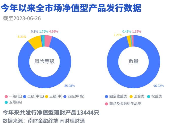 据南财理财通最新数据,截至2023年5月21日,今年以来全市场已发行净值型银行理财13,444只。