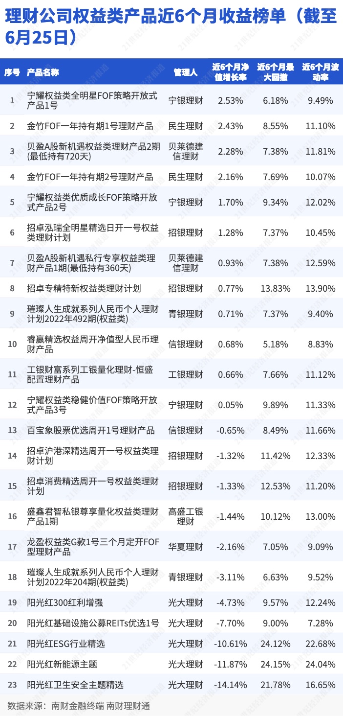 (近6个月理财公司权益类产品净值增长率 数据来源:南财理财通)