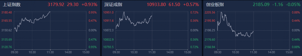 三大指数上午走势分化,沪指震荡走高涨近1%,创业板指则冲高回落翻绿。南财金融终端显示,截至上午收盘,上证指数涨0.93%,深证成指涨0.57%,创业板指跌0.05%。沪深两市个股涨多跌少,超4100只个股上涨。