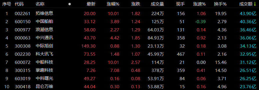 沪深两市半天成交额5177亿元,较上一交易日同期缩量1171亿元。个股方面,截至午间收盘,拓维信息成交额排名第一,达43.90亿元;中国船舶、浪潮信息、中兴通讯、中际旭创、科大讯飞、中船科技成交额在30亿元以上,分别为40.36、36.46、36.06、34.13、32.95、31.12亿元。