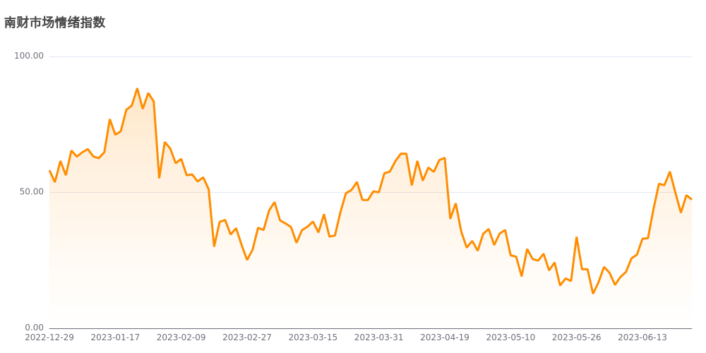 今日南财市场情绪指数为47.3,较前一交易日49.0下跌,市场投资热度降低。