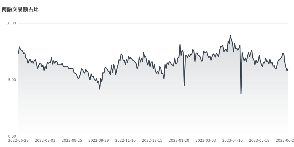 今日该指标值为6.03%,目前该指标处于近一年较低区间,说明投资者认为A股市场趋于触底反弹。反映场内投资者借钱炒股的杠杆水平,该指标越高说明杠杆水平越高,即投资者认为当前市场较强,反之则说明投资者认为市场相对较弱,因而与上证指数存在较强的正相关性。