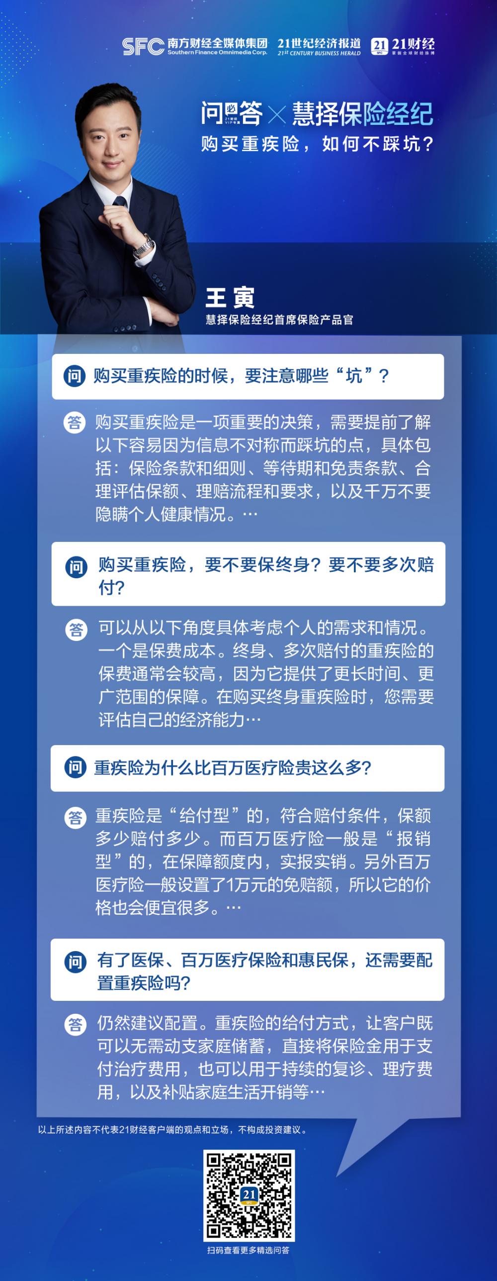 21财经客户端“问必答”特邀慧择保险经纪首席保险产品官王寅,为广大用户解读重疾保险话题。即日起,如果您有保险投保相关的财经问题,就来21财经客户端提问吧!现将王寅关于重疾险的精彩见解集纳如下,希望能帮您解开疑惑。