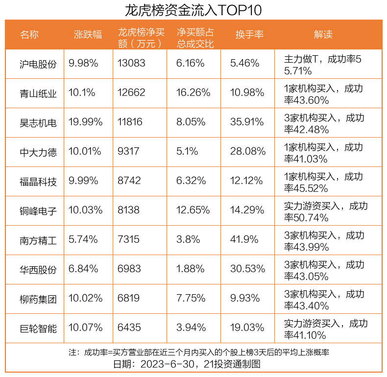 6月30日,上证指数上涨0.62%,深证成指上涨1.02%,创业板指上涨1.6%。盘后龙虎榜数据显示,共有62只个股因当日异动登上龙虎榜,资金净流入最多的是沪电股份(002463.SZ),达1.31亿元。