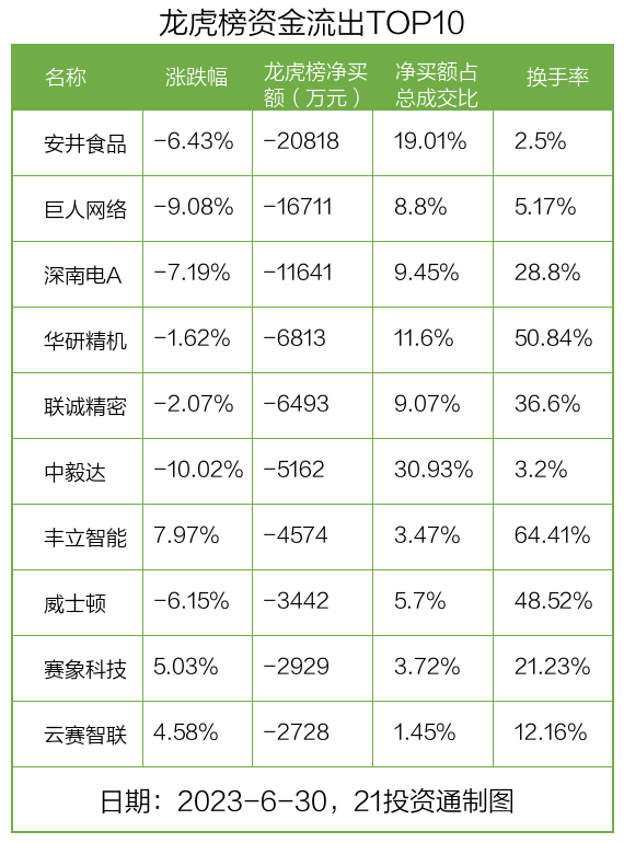 而龙虎榜中资金净流出最多的是安井食品(603345.SH),被净卖出为2.08亿元,占总成交金额的19.01%。安井食品收盘下跌6.43%,换手率为2.5%。