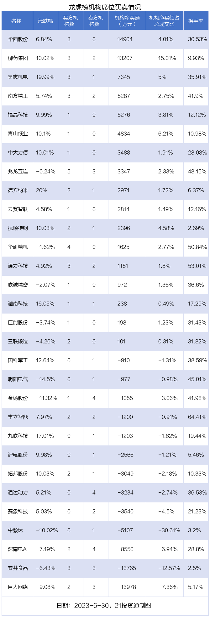6月30日,30只个股龙虎榜出现了机构的身影,机构合计净买入1.1亿元。具体来看,机构净买入17股,净卖出13股。