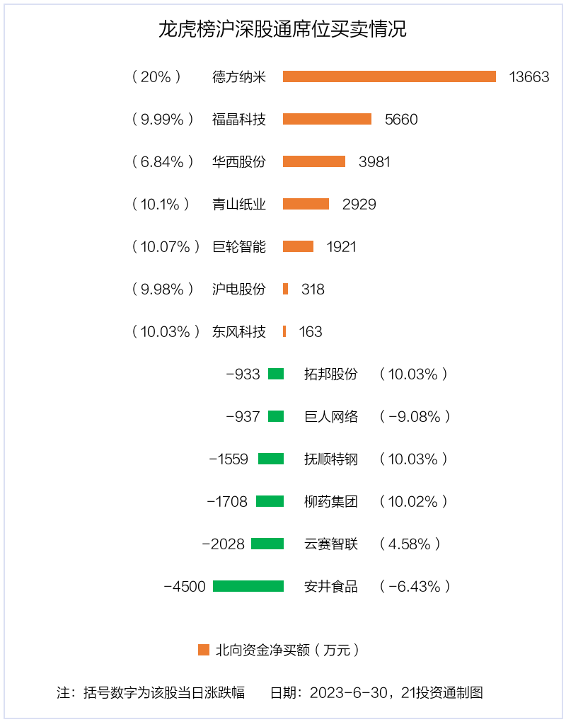 6月30日,北向资金参与龙虎榜中的个股共有13只,合计净买入1.7亿元。其中沪股通净买入2 股,净卖出4 股,合计净卖出6702.99万元;深股通净买入5 股,净卖出2 股,合计净买入2.37亿元。