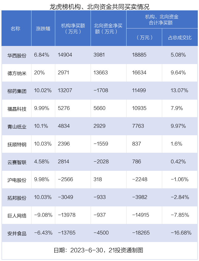 值得注意的是,机构和北向资金共同净买入了德方纳米、福晶科技、华西股份、青山纸业等4股;共同净卖出了拓邦股份、巨人网络、安井食品等3股;在沪电股份,抚顺特钢,柳药集团,云赛智联上出现分歧,机构净卖出沪电股份2566.22万元,北向资金净买入318.14万元;机构净买入抚顺特钢2395.95万元,北向资金净卖出1559.18万元;机构净买入柳药集团1.32亿元,北向资金净卖出1707.91万元;机构净买入云赛智联2814.15万元,北向资金净卖出2028.03万元。