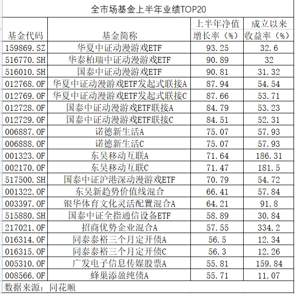 数据显示,Wind数据显示,公募基金上半年战绩中,榜单TOP20的收益率均在50%以上,其中,最高收益率为93.25%。其中,2023年上半场,共有3只基金净值涨幅超过90%,且全部为动漫游戏类主题类ETF。今年业绩表现居前的3只指数型基金同时也是全市场表现最好的基金,分别为华夏中证动漫游戏ETF、华泰柏瑞中证动漫游戏ETF和国泰中证动漫游戏ETF,均为跟踪中证动漫游戏指数的被动型基金,分别上涨93.25%、90.89%和90.81%。