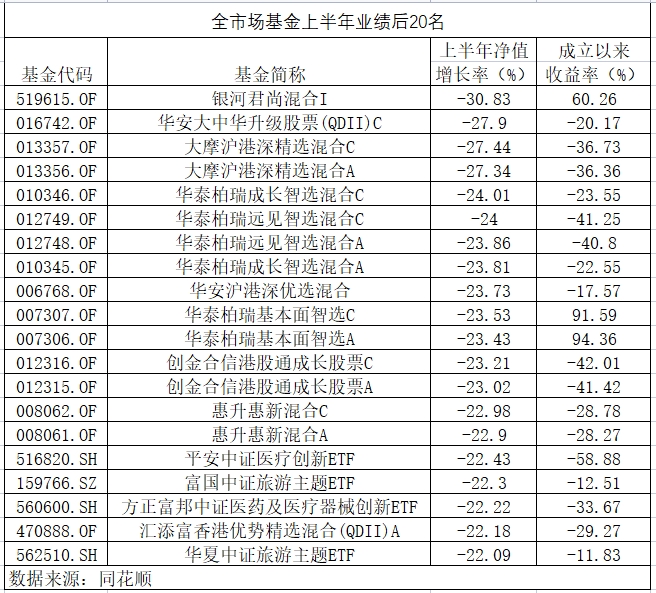 紧随其后的是华安大中华升级股票(QDII)C、大摩沪港深精选混合C,分别下跌了27.90%、27.44%。此外,大摩沪港深精选混合A、华泰柏瑞成长智选混合C、华泰柏瑞远见智选混合C、华泰柏瑞远见智选混合A、华泰柏瑞成长智选混合A等基金上半年跌幅均超过了20%。