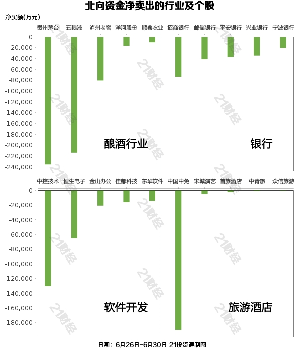北向资金净卖出贵州茅台(600519.SH)、五粮液(000858.SZ)、中国中免(601888.SH)、中控技术(688777.SH)、宁德时代(300750.SZ)居前,其中,贵州茅台被净卖出23.55亿元,五粮液被净卖出21.39亿元,中国中免被净卖出18.97亿元,中控技术被净卖出13.05亿元,宁德时代被净卖出12.99亿元。