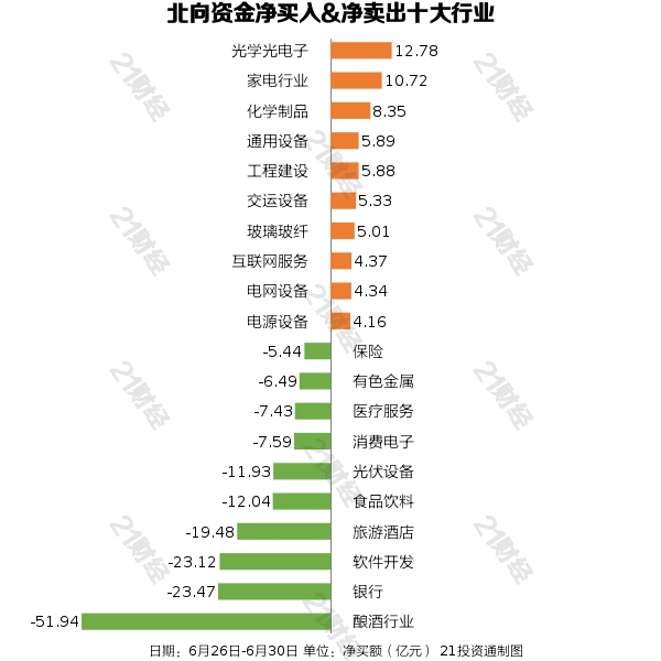 从净买入金额来看,北向资金增持了60个行业,其中光学光电子居首,净买入金额达12.78亿元,其次是家电行业,净买入10.72亿元。北向资金减持了40个行业,其中酿酒行业最多,净卖出金额达51.94亿元,其次是银行行业,净卖出23.47亿元。