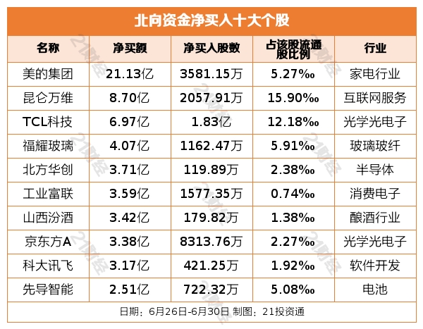 个股方面,北向资金净买入美的集团(000333.SZ)、昆仑万维(300418.SZ)、TCL科技(000100.SZ)、福耀玻璃(600660.SH)、北方华创(002371.SZ)居前,其中,美的集团被净买入21.13亿元,昆仑万维被净买入8.70亿元,TCL科技被净买入6.97亿元,福耀玻璃被净买入4.07亿元,北方华创被净买入3.71亿元。