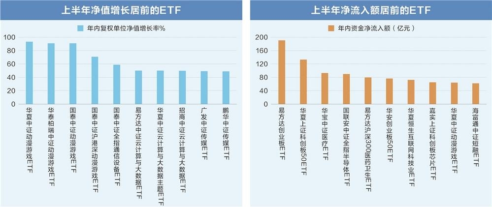 从单只基金来看,华夏中证动漫游戏ETF、华泰柏瑞中证动漫游戏ETF和国泰中证动漫游戏ETF上半年回报率居前,净值增长率均为90%以上;多只追踪云计算与大数据指数的ETF也表现优异,年内累计净值涨幅均超45%。此外,4只追踪纳斯达克100指数的QDII(合格境内机构投资者)基金净值增长率也进入前20名,净值增长率均超40%。