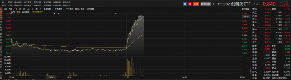 跟踪该指数的ETF中规模最大的创新药ETF(159992)午后放量走高,截至发稿,上涨1.57%,成交额近3亿元。