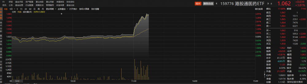 港股方面,医疗医药股午后同样出现明显拉升。相关指数中,中证港股通医药卫生综合指数 (930965)放量走高。跟踪该指数的港股通医药ETF(159776)大涨,截至发稿,涨幅近4%,盘中持续溢价交易,发稿时溢折率为0.16%。