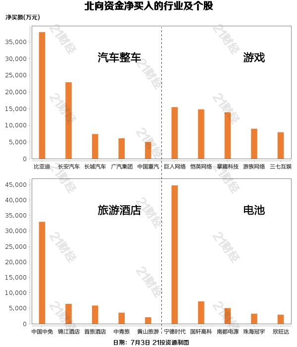 个股方面,北向资金净买入宁德时代(300750.SZ)、歌尔股份(002241.SZ)、比亚迪(002594.SZ)、中际旭创(300308.SZ)、中国中免(601888.SH)居前,其中,宁德时代被净买入4.47亿元,歌尔股份被净买入4.26亿元,比亚迪被净买入3.79亿元,中际旭创被净买入3.63亿元,中国中免被净买入3.29亿元。