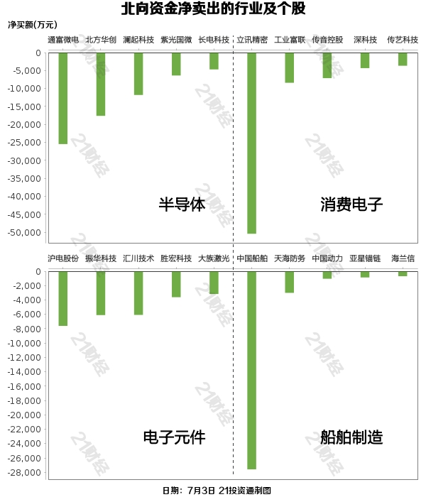 北向资金净卖出立讯精密(002475.SZ)、中国船舶(600150.SH)、通富微电(002156.SZ)、三花智控(002050.SZ)、北方华创(002371.SZ)居前,其中,立讯精密被净卖出5.04亿元,中国船舶被净卖出2.76亿元,通富微电被净卖出2.55亿元,三花智控被净卖出2.44亿元,北方华创被净卖出1.76亿元。